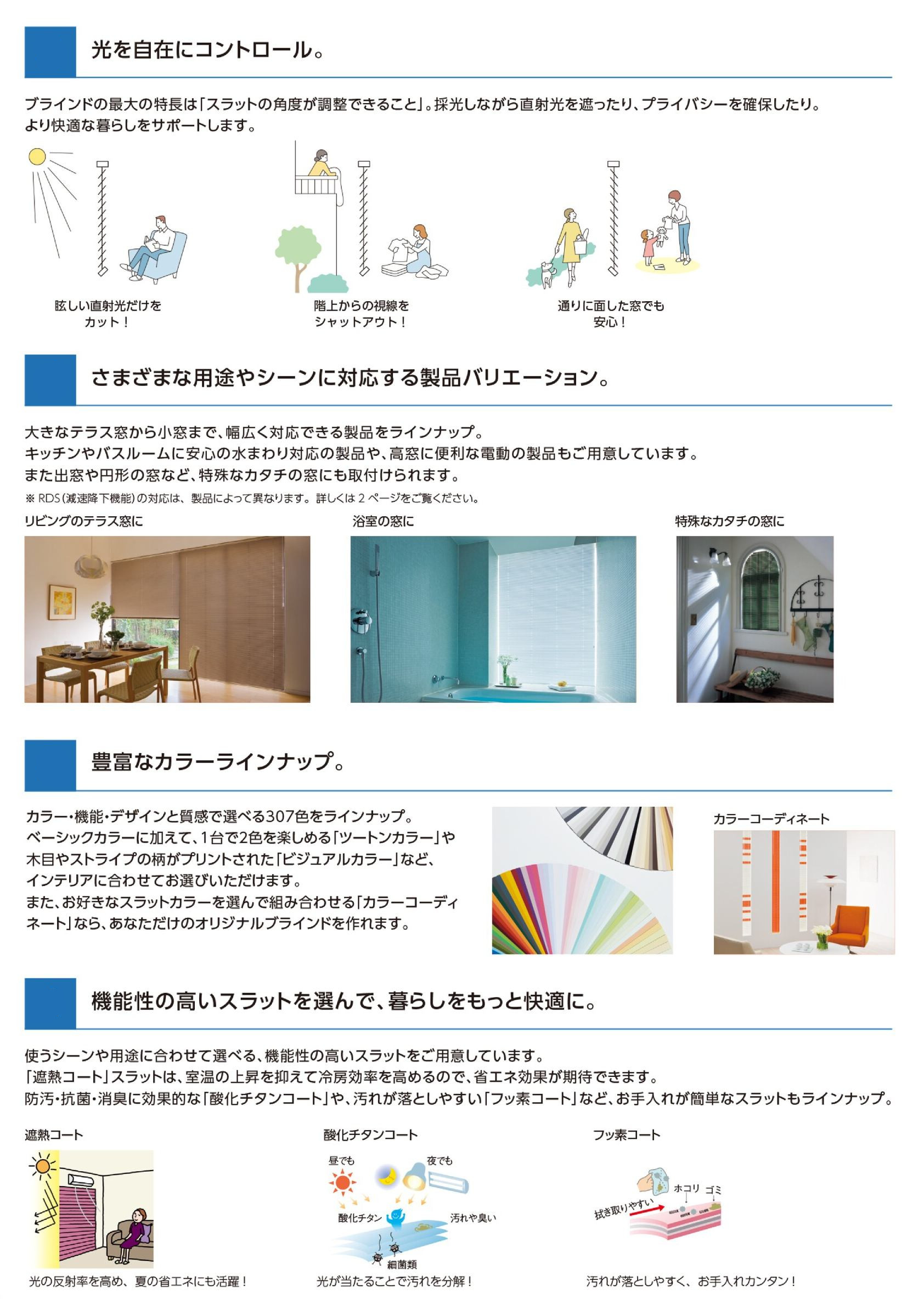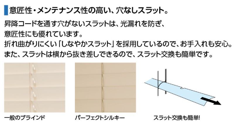 | ●コメント | 視線や光の入り具合が調整可能なブラインドも人気です。 「パーフェクトシルキー」はサビにくい耐水仕様なので水まわりでも安心です。 汚れが付きにくく、かつ簡単に落とせるフッ素コートスラットもおススメです。こちらはベーシックカラー商品価格の1割アップ。 |