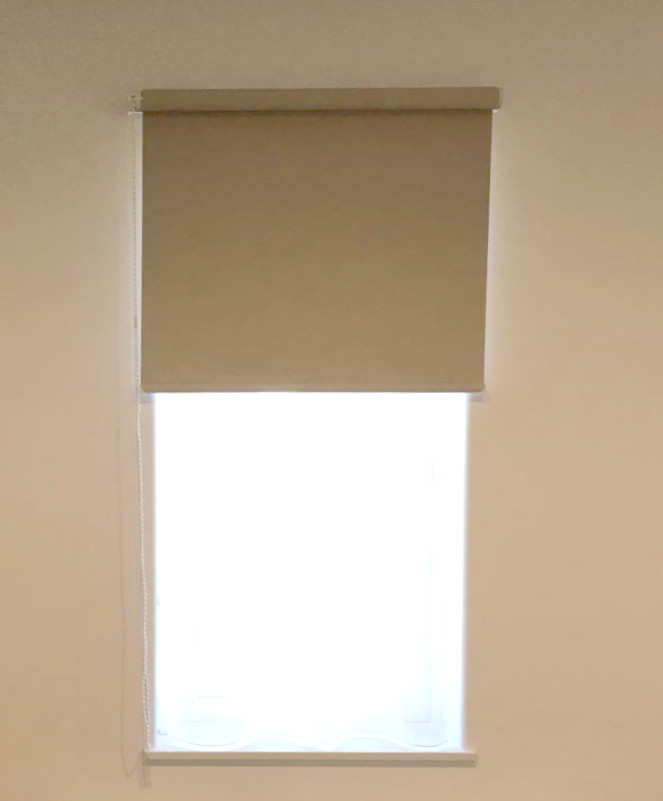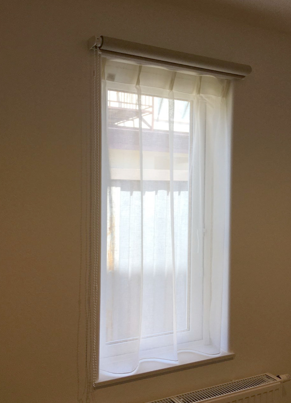 | ●コメント | ロールスクリーンは遮光生地で正面付けにすることで、隙間からの光漏れを軽減。昼間ロールスクリーンを開けた時にも外からの視線や直射日光を和らげるために、窓枠中にレースを取り付けています。 レース生地はリネンライクな質感でナチュラルテイストなお部屋にピッタリです。 |