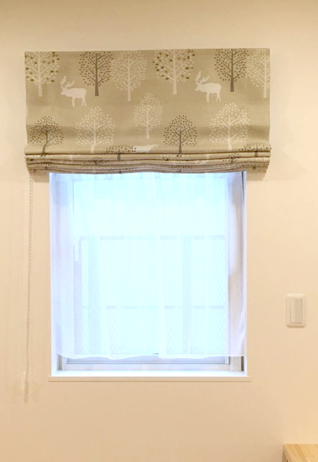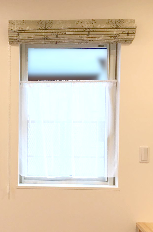| ●コメント | 同室の大きな窓は、プレーンシェードと同じ生地で両開きのカーテン、カフェレースと同じレース生地で両開きレースカーテンに。統一感のある窓まわりになります。 小さな窓には上部にたたみ上がるタイプがスッキリしておススメです。 |