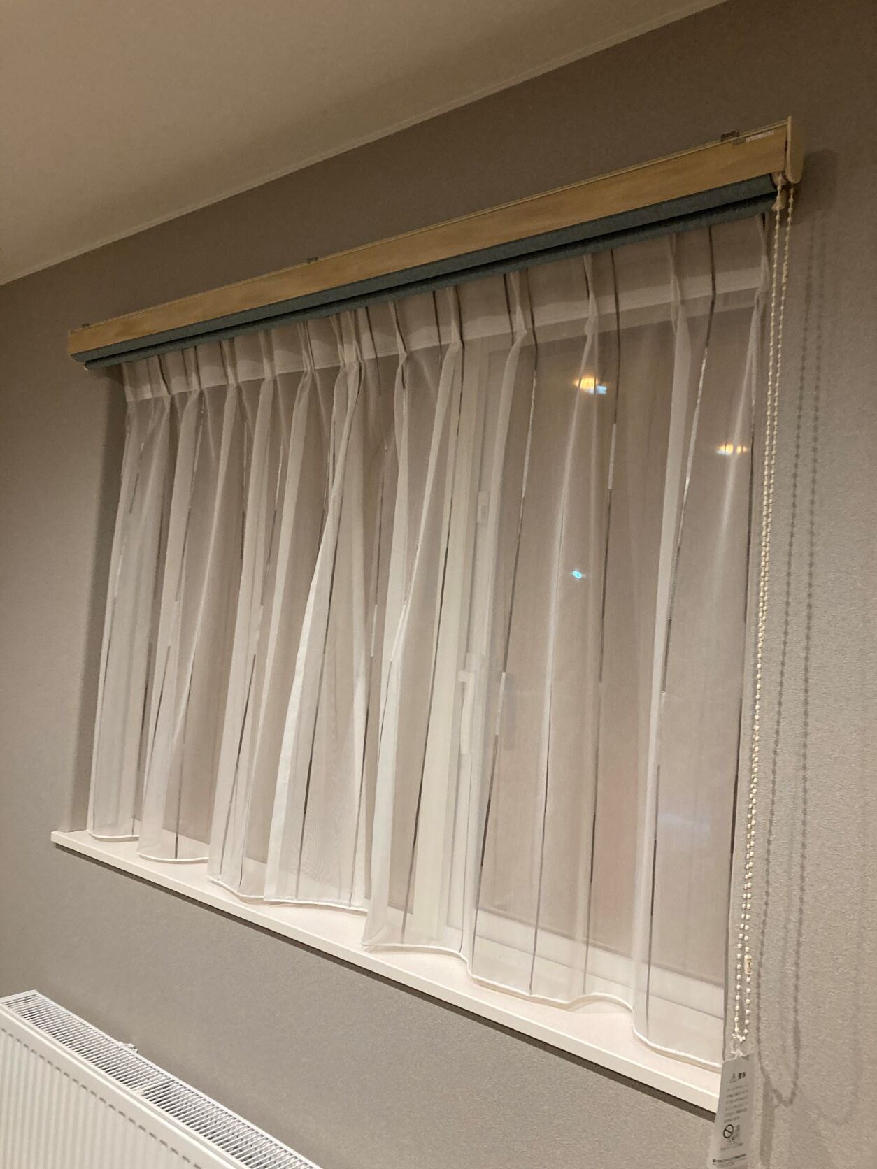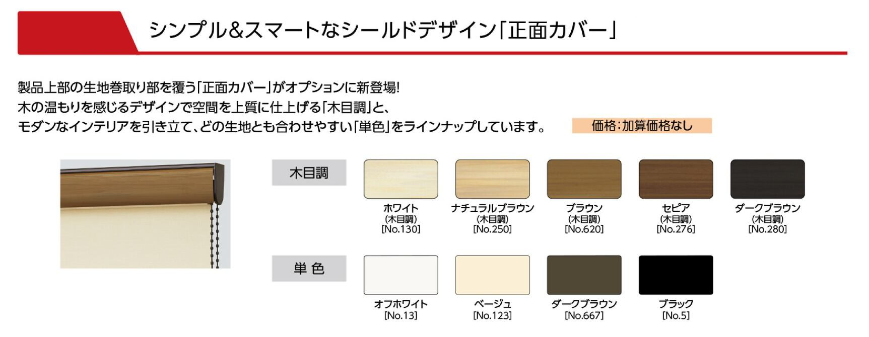 | ●コメント | 同室小窓も同じロールスクリーンです。 ポイント色にもなるロールスクリーンの生地でスッキリまとまっています。 木目調の正面カバーが付いたロールスクリーンです。加算価格なしで選んでいただけます。木の温もりを感じるデザインで空間を上質に仕上げます。木目調は5色、単色は4色あります。 窓枠内にレースカーテンを付けることで、昼間ロールスクリーンを開けていても外からの視線や強い日差しを少し遮ることができます。 |