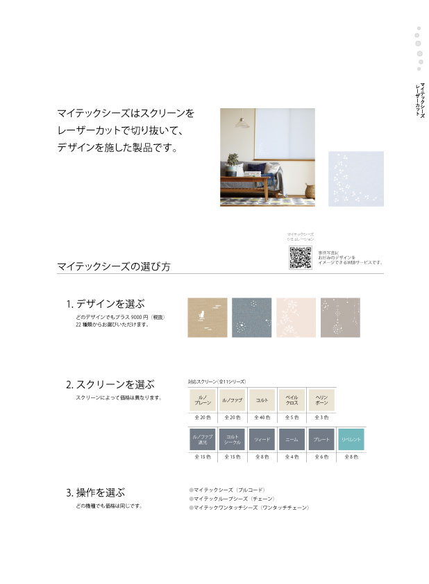 | ●コメント | レーザーカットされた部分から光が漏れて、シンプルなロールスクリーンに遊び心が加わり、窓辺の表情が豊かになります。 背の高い窓やあまり視線が気にならない場所に適しています。 カットデザインは20種類。生地も11種類の中からそれぞれカラーも選べます。 |