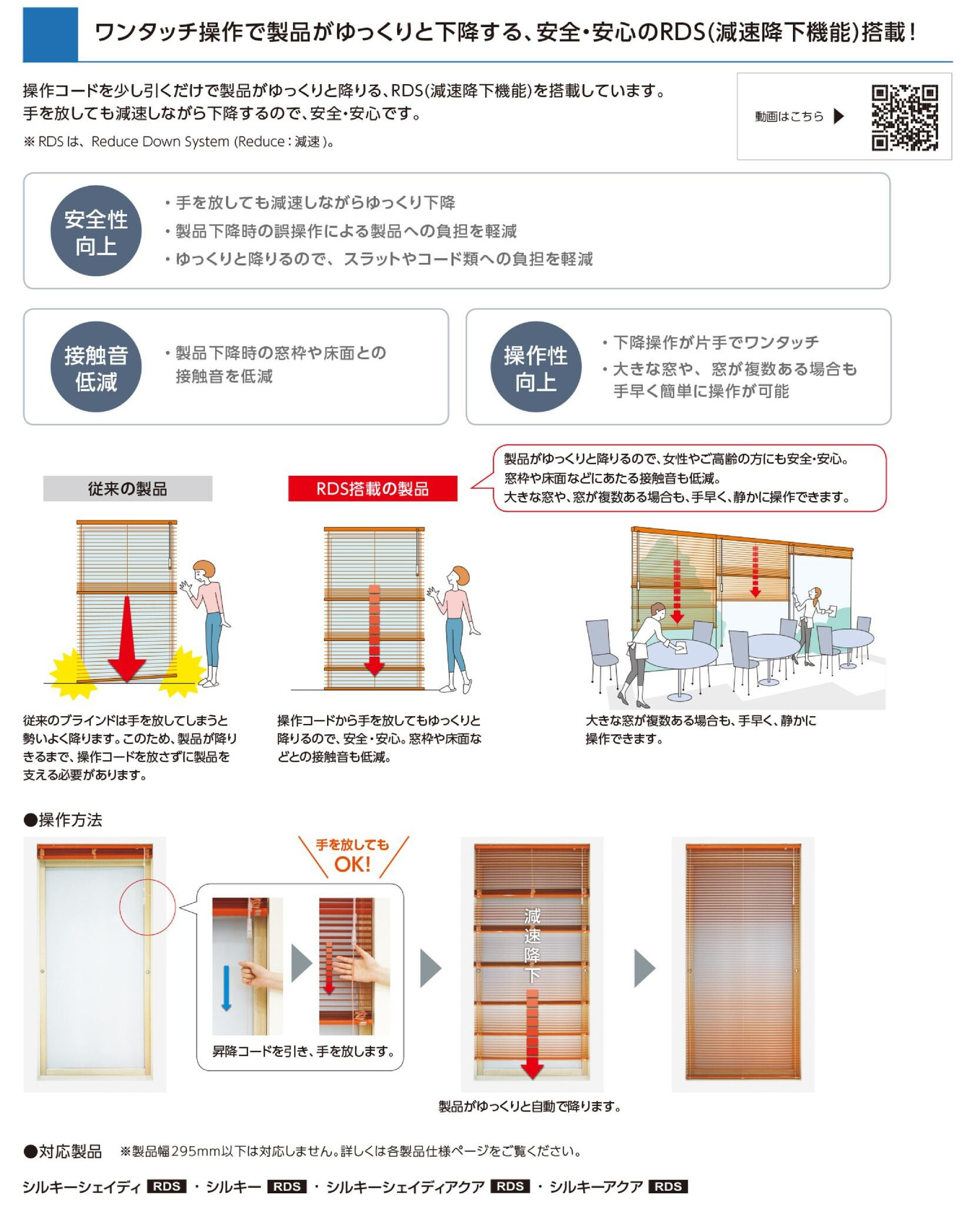 | ●コメント | 光や目線の調整ができるのがブラインドのおススメポイントです。 開閉が多い窓に取り付けたブラインドにはRDS(減速降下機能 ※画像参照)搭載を選ぶと、安全性・操作性が向上され、安心です。 |