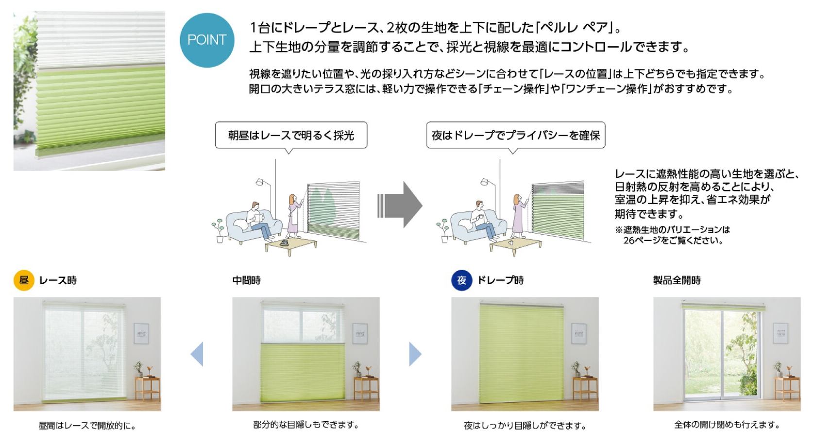 | ●コメント | ロールスクリーンにも同じ生地があります。和室のイメージが強いプリーツですが、洋室にもピッタリです。 同じ空間で生地と色を合わせて使ってみるのもいいですね。 レース生地を上部か下部かお部屋の状況に合わせで選べます。 厚地、レース生地それぞれのシングル仕様もあります。 ・厚地シングル(マカロン)¥34,650(税込) ・レースシングル(フェアリー)¥47,960(税込) |